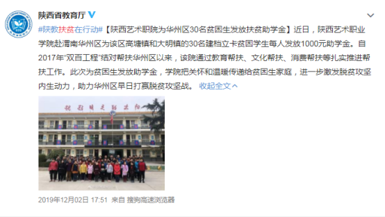 #陕教扶贫在行动#【陕西艺术职院为华州区30名贫困生发放扶贫助学金】近日,陕西艺术职业学院赴渭南华州区为该区高塘镇和大明镇的30名建档立卡贫困学生每人发放1000元助学金。自2017年“双百工程”结对帮扶华州区以来,该院通过教育帮扶、文化帮扶、消费帮扶等扎实推进帮扶工作。此次为贫困生发放助学金,学院把关怀和温暖传递给贫困生家庭,进一步激发脱贫攻坚内生动力,助力华州区早日打赢脱贫攻坚战。