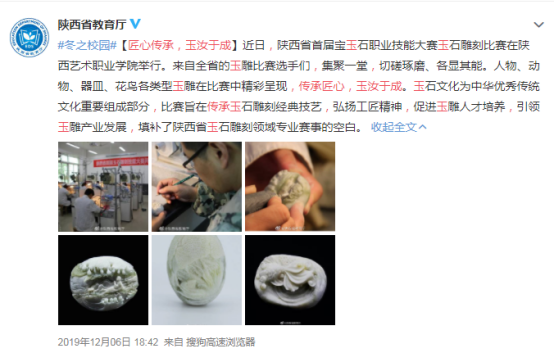 #冬之校园#【匠心传承,玉汝于成】近日,陕西省首届宝玉石职业技能大赛玉石雕刻比赛在陕西艺术职业学院举行。来自全省的玉雕比赛选手们,集聚一堂,切磋琢磨、各显其能。人物、动物、器皿、花鸟各类型玉雕在比赛中精彩呈现,传承匠心,玉汝于成。玉石文化为中华优秀传统文化重要组成部分,比赛旨在传承玉石雕刻经典技艺,弘扬工匠精神,促进玉雕人才培养,引领玉雕产业发展,填补了陕西省玉石雕刻领域专业赛事的空白。
