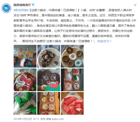 #教改探索#【这家火锅店,中国味道!巴适得板!】火锅,古称“古董羹”,因食物投入沸水时发出“咕咚”声而得名,是中国独创的美食,老少皆宜,是冬之佳品。近日,陕西艺术职业学院学前教育专业学生用KT板、牛皮纸板、超轻黏土、不织布、一次性纸盘等创作的环境创设作品《中国味道火锅店》,角色扮演区域以中国传统色调黄棕色为主,融入川剧脸谱元素,提供了角色扮演所需的丰富火锅菜品与道具,让孩子们在游戏与扮演的过程中,感受快乐,发展社会交往能力,感受中国传统文化与美食的美好。精致的场景细节设置、逼真的各种菜品、浓浓的中国风……围观师生不由赞叹“这家火锅店,中国味道!巴适得板!”。