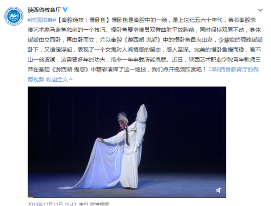 #校园拍客#【秦腔绝技:慢卧鱼】慢卧鱼是秦腔中的一绝,是上世纪五六十年代,著名秦腔表演艺术家马蓝鱼独创的一个技巧。慢卧鱼要求演员双臂曲肘平放胸前,同时保持双肩不动,身体缓缓由立而卧,再由卧而立,尤以秦腔《游西湖·鬼怨》中的慢卧鱼最为出彩,李慧娘的魂魄缓缓卧下,又缓缓浮起,表现了一个女鬼对人间情感的留恋,感人至深。完美的慢卧鱼慢而稳,看不出一丝波澜,这需要多年的功夫,绝非一年半载所能练就。近日,陕西艺术职业学院青年教师王萍在秦腔《游西湖·鬼怨》中精彩演绎了这一绝技,我们点开视频欣赏吧!