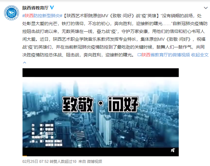 上一条:全国高校志愿服务联盟微博《陕西艺术职院原创MV<致敬·问好>战“疫”英雄》