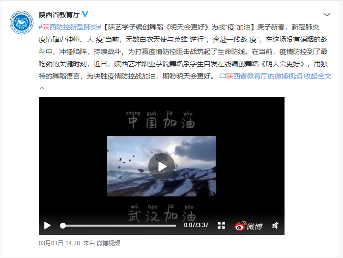 下一条:陕西省教育厅《陕西艺术职院<赞歌献给逆行者>助力疫情防控战》