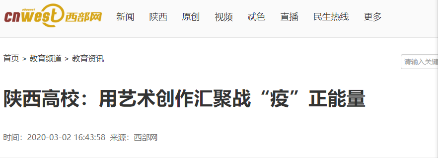 西部网讯 在抗击新冠肺炎这场人民战争、总体战、阻击战中,陕西高校师生拿起手中的笔,写词作曲、绘图编舞,发时代先声,用一件件艺术作品传递真爱,增强信心、温暖人心,为逆行者助威,为同胞们加油鼓劲。