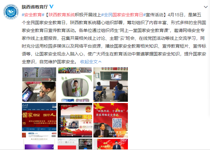 转载链接:https://s.weibo.com/weibo/%25E9%2599%2595%25E8%25A5%25BF%25E6%2595%2599%25E8%2582%25B2%25E7%25B3%25BB%25E7%25BB%259F%2520%25E5%259B%25BD%25E5%25AE%25B6%25E5%25AE%2589%25E5%2585%25A8%25E6%2595%2599%25E8%2582%25B2%25E6%2597%25A5?topnav=1&wvr=6&b=1