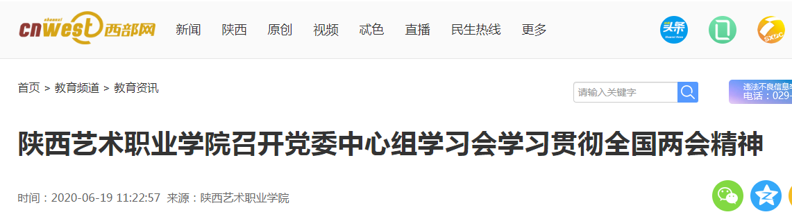 6月17日,陕西艺术职业学院在文艺南路老校区五楼会议室召开党委理论学习中心组学习会,深入学习贯彻2020年全国两会精神。陕西艺术职业学院党委书记刘正利,党委副书记、院长杨孝龙及其他院领导班子成员,党政办、宣传统战部、监察审计处、工会、思政部、团委等部门负责人参会。会议由党委书记刘正利主持。