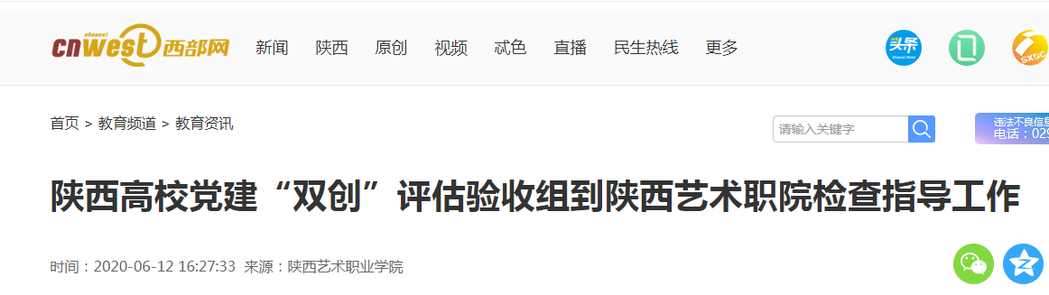 6月10日下午,省委教育工委高校党建“双创”评估验收工作组第九组组长、西安邮电大学党委副书记张新柱一行4人到陕西艺术职业学院,就教育部和全省第二批高校党建工作“样板支部”创建工作进行督导检查和中期评估。陕西艺术职院党委书记刘正利,党委副书记、副院长肖幸海,党委委员、干部人事处处长刘艳萍,影视系直属党支部书记胡丽娟,干部人事处副处长黄小欢,影视系副主任王亮等参加汇报会。
