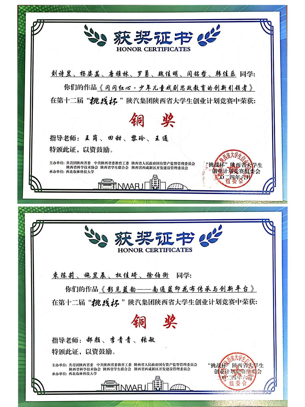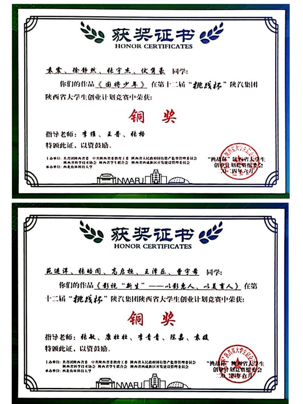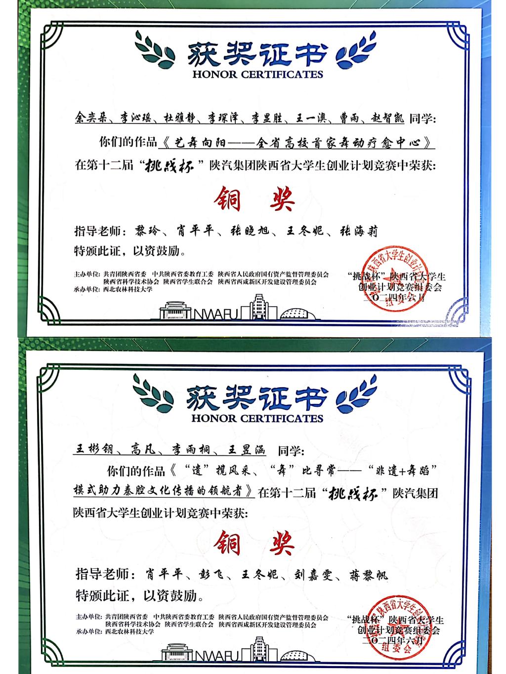 2024年6月7日,由共青团陕西省委,中共陕西省委教育工委,陕西省人民政府国有资产监督管理委员会,陕西省科学技术协会,陕西省学生联合会,陕西省西咸新区开发建设管理委员会联合主办的第十二届“挑战杯”陕汽集团陕西省大学生创业计划竞赛闭幕式暨颁奖仪式在西北农林科技大学举办。在此次比赛中我校再创新高,喜获金奖一项、银奖三项,铜奖六项,我校也荣获“优秀组织奖”和“进步显著奖”,是我校“挑战杯”赛事中获得奖项最高、最多的一次。