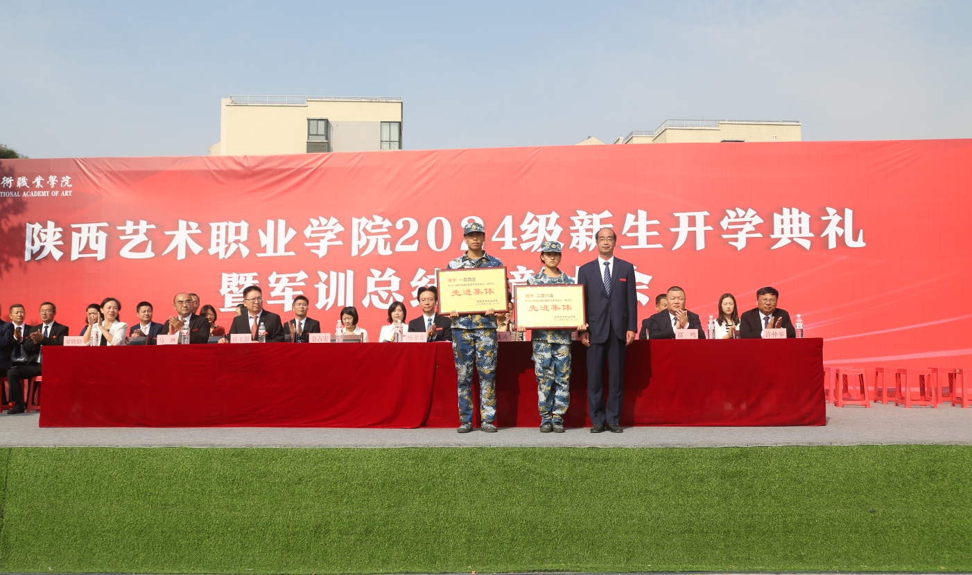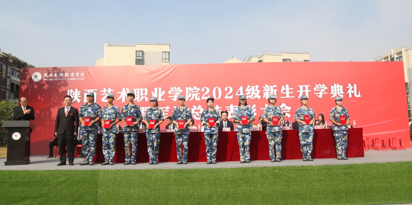 马琳了宣读陕西艺术职业学院关于2024级学生军训优秀连队、优秀学员的表彰决定。杨孝龙代表学校为承训基地赠送锦旗。郑毅刚、任玉银、邵鸣分别为优秀连队、优秀学员颁奖。全体校领导为2024级新生代表佩戴校徽。