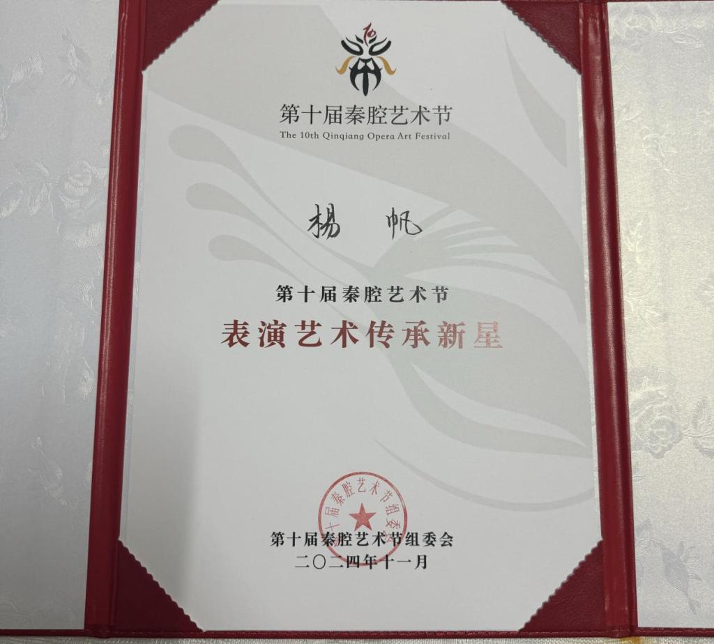 11月11日晚,由中国戏剧家协会、陕西省文学艺术界联合会、西安市人民政府主办,陕西省戏剧家协会、西安市委宣传部、西安市文化和旅游局、西安市总工会、西安市文学艺术界联合会、西安曲江新区管理委员会承办的第十届秦腔艺术节,在西安开元大剧院圆满闭幕。闭幕式上,中国戏剧家协会为第十届秦腔艺术节的20位“表演艺术传承新星”颁发证书,表彰他们在秦腔的传承发展和创新上做出的贡献。我校学子杨帆荣誉榜上,成为本届获奖中年龄最小的传承之星,也成为继刘治荣获2024年中国秦腔优秀剧目会演“表演艺术传承英才”后,再次获得“表演艺术传承之星”的陕艺学子。
