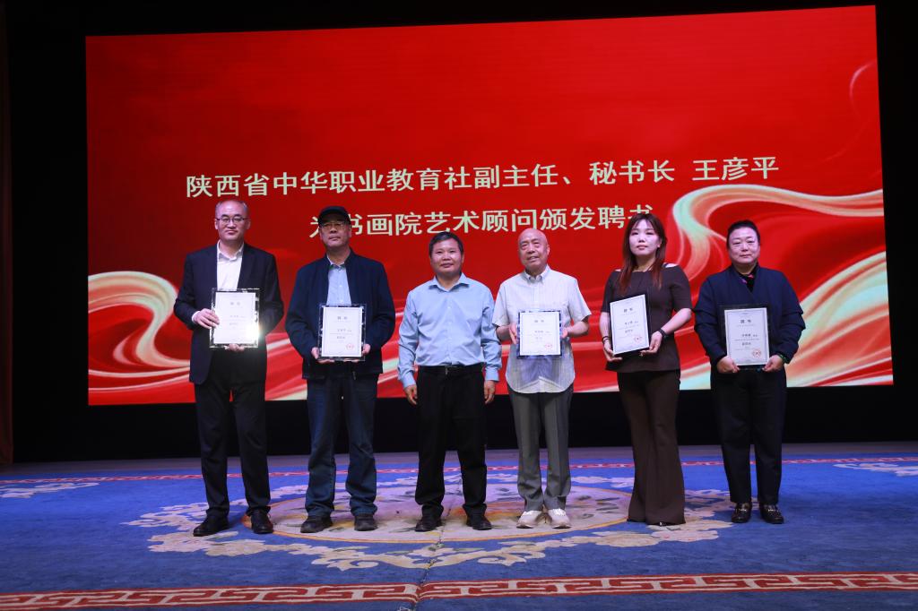 陕西省中华职业教育社副主任、秘书长王彦平为书画院院长李明富,副院长佘占宏、王廷华、朱小艳、刘晓娟,艺术顾问岳崇、吴福春、李云集颁发聘书