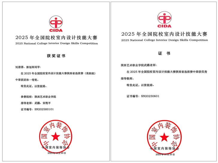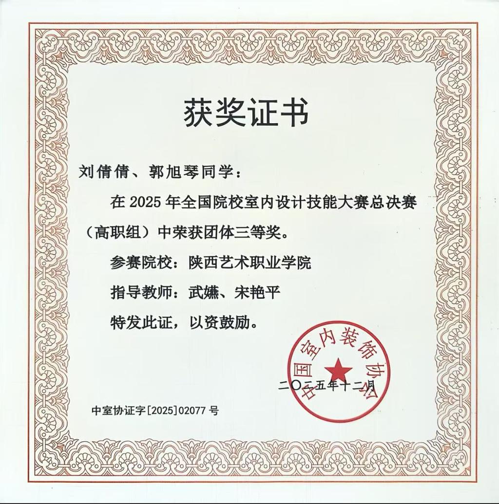 近日,在中国室内装饰协会主办的2025年全国院校室内设计技能大赛中,陕西艺术职业学院美术与设计学院室内设计工作室捷报频传:我校参赛队伍荣获陕西赛区一等奖,并在全国总决赛中斩获三等奖,充分展现了我校在室内设计专业人才培养和实践教学方面的综合实力。