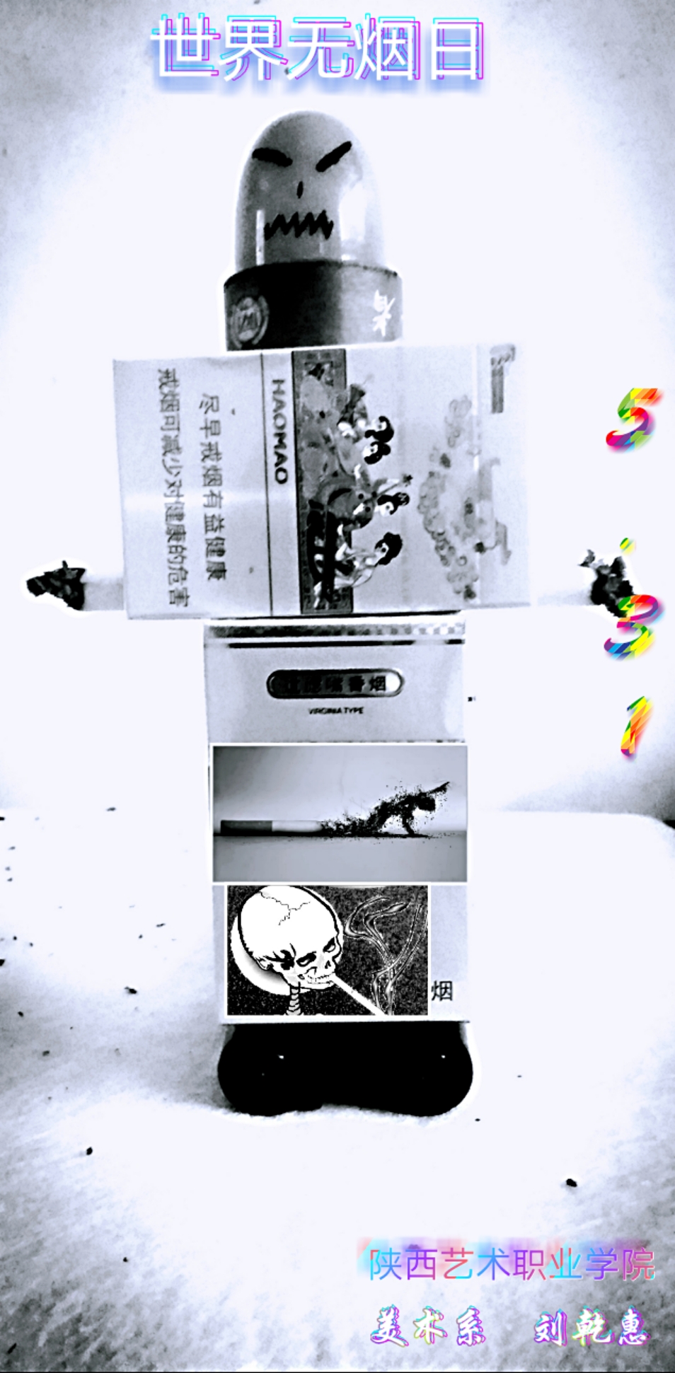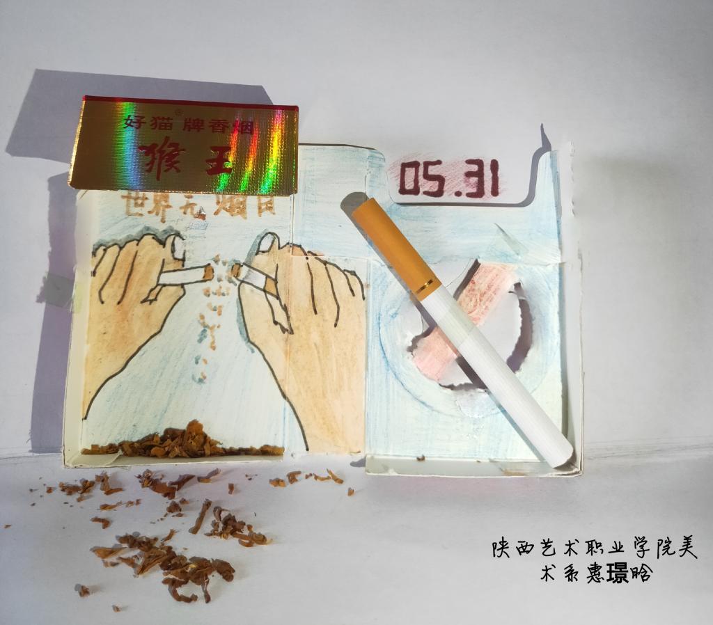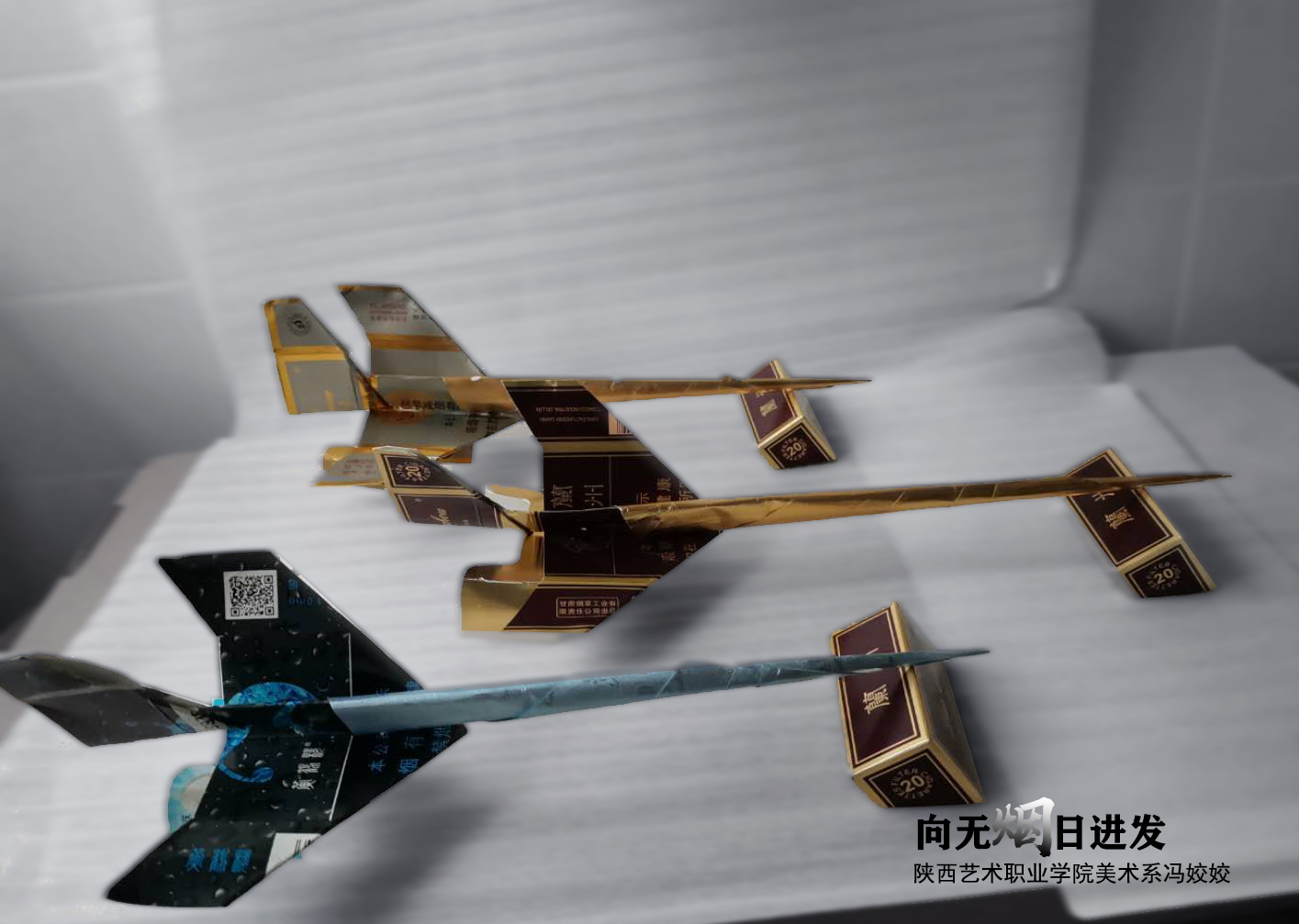 烟盒战斗飞机向无烟日进发、燃烧的烟盒彩衣向香烟告别、上锁的烟盒还你健康呼吸……在第33个世界无烟日、第71个国际儿童节来临之际,陕西艺术职业学院美术系学生围绕今年世界无烟日“保护青少年远离传统烟草产品和电子烟”主题,以“烟盒”为主要创作材料,发挥专业特长,将禁烟理念寓于奇思妙想的手工艺品、海报和造型设计中,向广大师生宣传无烟、禁烟的健康理念,主动远离传统烟草产品和电子烟,培养健康生活方式,并呼吁所有成年人行动起来,支持控烟,参与控烟,从守护孩子的健康做起,送给孩子们一份最珍贵的节日礼物——无烟健康的世界!