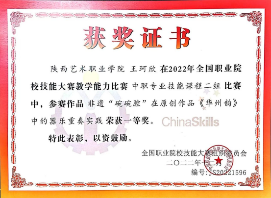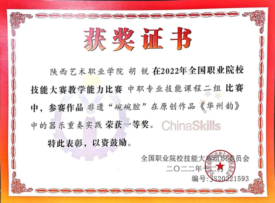 近日,2022年全国职业院校技能大赛教学能力比赛荣誉证书送达我校,由我校音乐学院胡锐、马赫苒、郝艺洁、王珂欣4位老师的参赛作品《非遗“碗碗腔”在原创作品<华州韵>中的器乐重奏实践 》喜获全国一等奖。