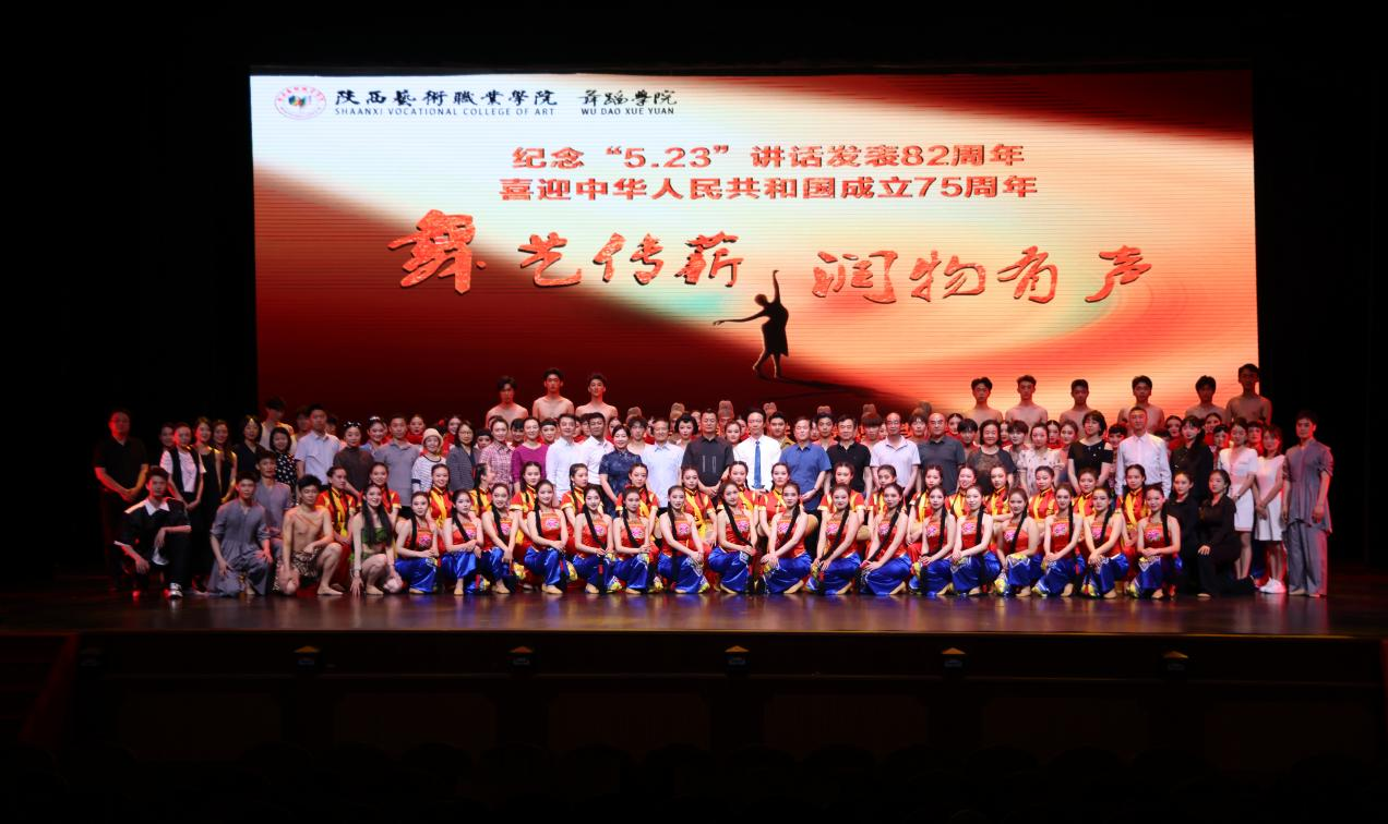 为纪念毛泽东同志《在延安文艺座谈会上的讲话》发表82周年,喜迎中华人民共和国成立75周年,5月21日下午,陕西艺术职业学院在陕歌大剧院举办了“舞艺传薪,润物有声”舞蹈原创获奖作品展演。陕西艺术职业学院党委副书记、校长杨孝龙,党委副书记佘占宏,党委副书记、纪委书记郑毅刚,党委委员、副校长马琳,陕西省舞蹈家协会名誉主席王宏,西安音乐学院舞蹈学科创始人王倩,国家级非物质文化遗产陕北秧歌传承人翟红,陕西省舞蹈家协会、陕西省歌舞剧院、省内艺术高校专家和领导,以及陕西艺术职业学院师生300余人共同参加了本次活动。