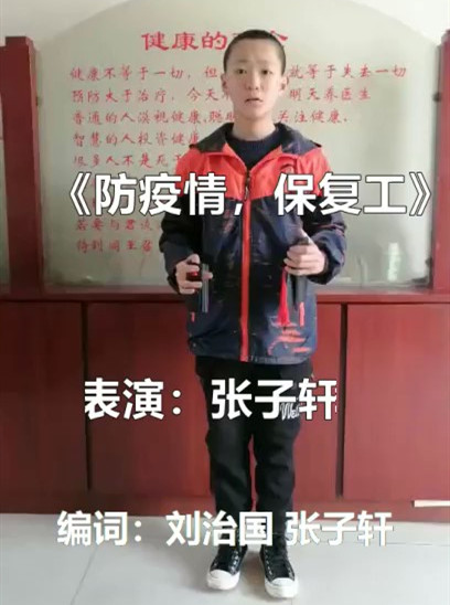 “齐心抗疫见曙光,复产复工在路上,当前需要两手抓,两手都要有力量……”当前,经过全国上下同心战“疫”,疫情防控形势日趋好转,复工复产有序进行。近日,陕西艺术职业学院戏曲系学生张子轩与老师刘治国共同编创快板《防疫情,保复工》,用喜闻乐见的艺术形式,通俗易懂的语言,生动的表演,倡议人们在紧锣密鼓复工复产的同时,疫情防控也要毫不放松,团结一心,坚决打赢疫情防控战与脱贫攻坚战,确保全面建成小康社会。