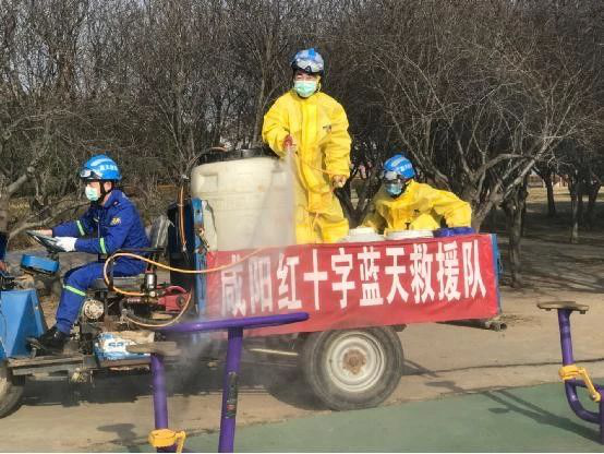 张佳轩(中)与队友对咸阳市区公共场所进行防疫消毒