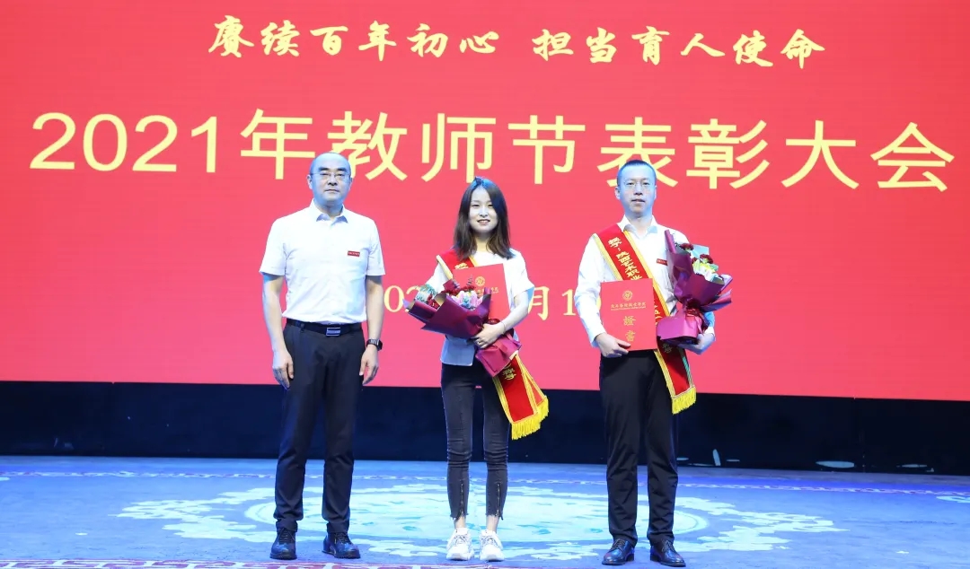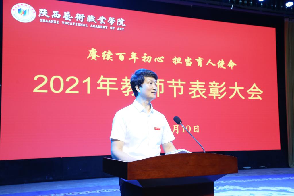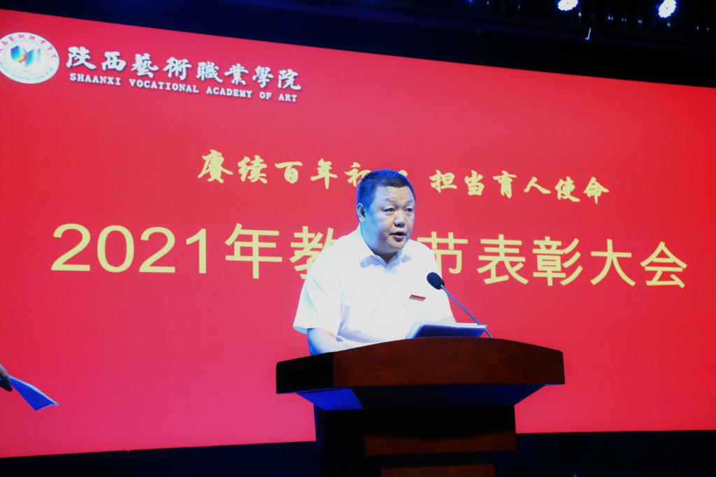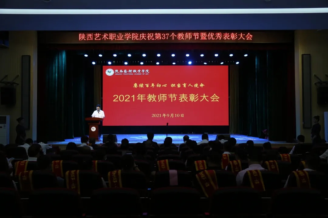 奏唱国歌后,邵鸣宣读了《关于表彰“光荣在教30年”人员的决定》《陕西省教育厅关于表彰第十二届陕西高职院校教学名师奖获奖教师的通知》《文化和旅游部办公厅关于通报表扬百名优秀戏曲专业专兼职教师的通知》《关于表彰陕西艺术职业学院第一届教学名师的决定》《关于表彰2021年度优秀教师、优秀教育工作者、优秀辅导员(班主任)的决定》。随后,院领导依次为各类受表彰教师颁发荣誉证书,学生代表向各位受表彰老师献花。