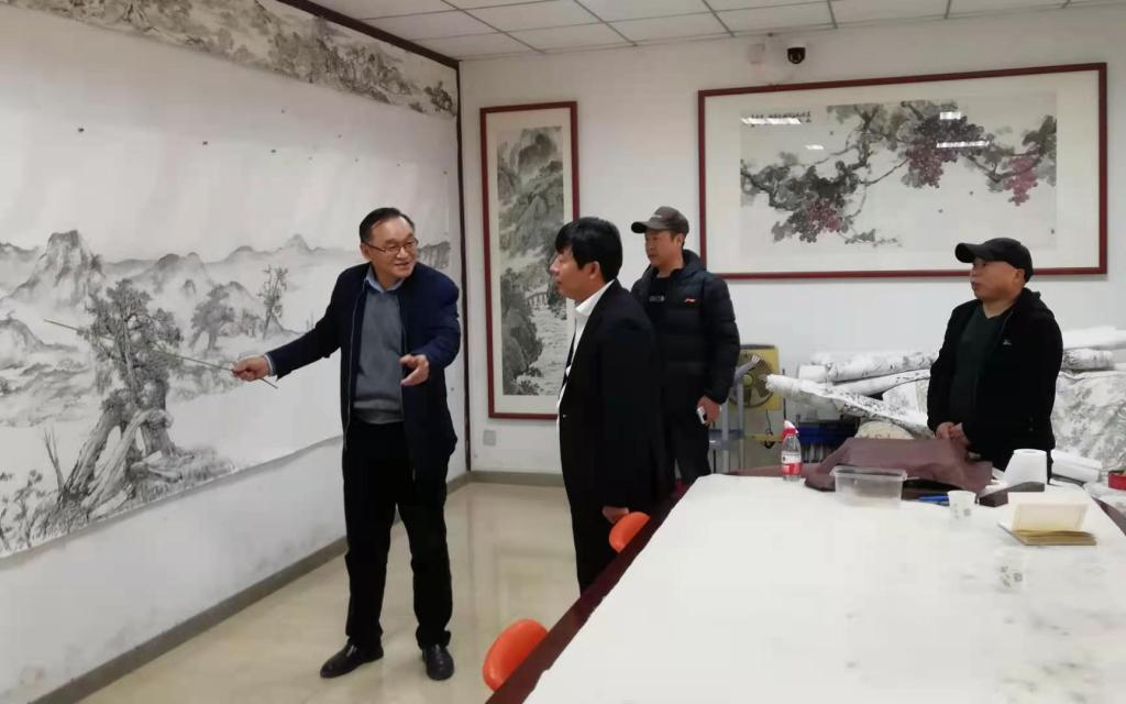 陈梦榆现场查看了《根深叶茂》创作情况,详细询问了团队创作历程,对项目创作给予肯定,他表示,树高千尺根深在沃土,以美术史上少有的古树长卷,回溯中国共产党波澜壮阔的百年征程,主题宏大,题材独特,角度新颖,体现了作品的创新性;山石云水、建筑、人物等与古树相得益彰,细微处见精神,体现了作品的艺术性。针对接下来的创作,他希望创作团队在背景中要进一步突出中国共产党的精神标识,将红色地标与100棵古树有机融合,审美化呈现,精益求精,力争创作出思想精深、艺术精湛的精品力作,为中国共产党百年华诞献礼。