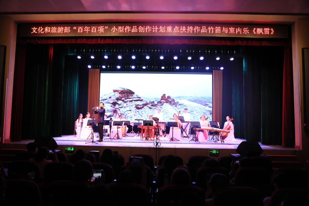 近日,文化和旅游部“庆祝中国共产党成立100周年舞台艺术精品创作工程”“百年百项”小型作品创作计划重点扶持作品竹笛与民族室内乐《飘雪》项目验收演出在陕西艺术职业学院实验剧场成功上演。省文旅厅艺术处副处长吉蕾、陕西省歌舞剧院有限公司歌舞团团长党红岩、院党委委员、副院长任玉银、科研处处长李永春、音乐系直属党支部书记郝叶妮及音乐系师生共同观看演出。