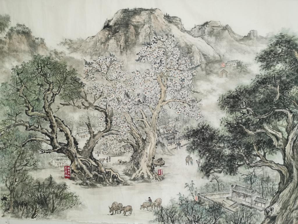 目前,经过一年多的努力,《根深叶茂》经过十余次专家座谈、论证,已完成了素材收集、线描稿、小墨稿、碳稿、百棵古树及背景的落墨着色、最后汇审等工作,将在进一步完善基础上,积极筹备“七一”前后展出事宜。