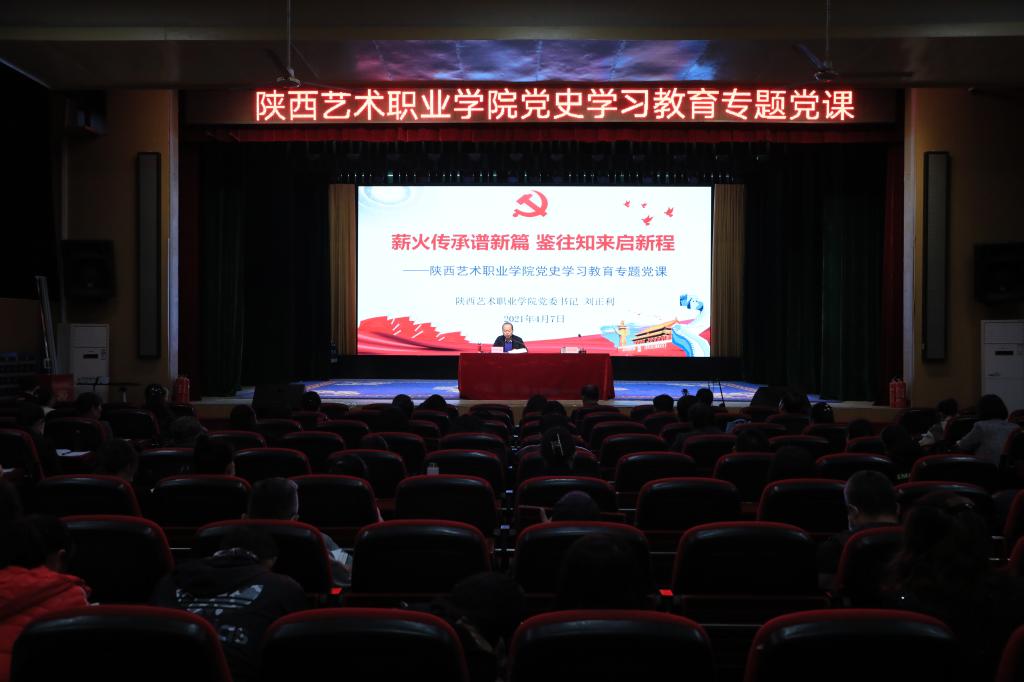 4月7日,陕西艺术职业学院党委书记刘正利在文艺南路校区小剧场讲题为《薪火传承谱新篇 鉴往知来启新程》的党史学习教育专题党课。院党委理论学习中心组成员、科级以上干部、党群部门人员以及思政部、基础部、戏曲系等系部教师听取党课。院党委副书记佘占宏主持授课仪式。